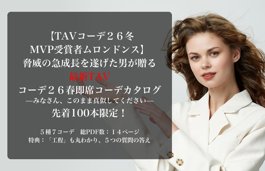 ▶︎TAVコーデ26冬MVP受賞者ムロンドンス◀︎脅威の急成長を遂げた男が贈る最新TAVコーデ26春即席コーデカタログ—みなさん、このまま真似してください—先着100本限定!